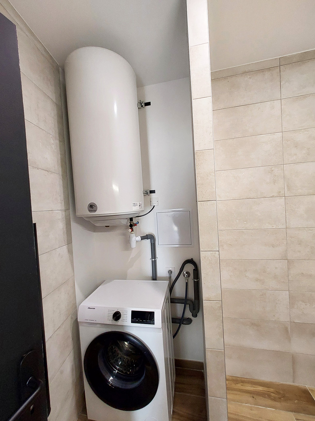 - Un coin technique avec chauffe-eau mural et machine à laver
